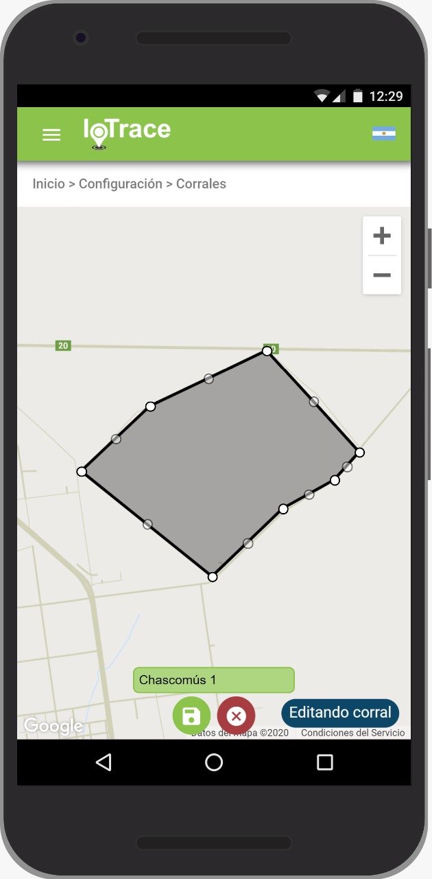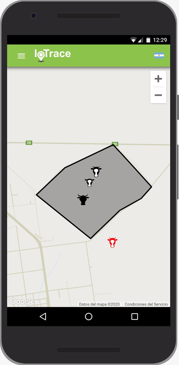 - Mapeo y Geocercas del Establecimiento: con esta función se puede delimitar el perímetro y dividir en potreros o parcelas toda la explotación a partir de imágenes cartográficas, asignándoles nombres y descripciones a cada potrero. El uso de Geocercas (geofencing) permite controlar la permanencia de los animales o lotes identificados con IoTrace dentro del perímetro definido o emitir alertas cuando los mismos salen de estas.